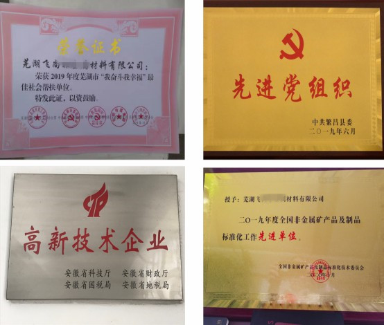 公司黨支部連續(xù)三年獲得鎮(zhèn)及縣級先進黨支部稱號;2019年榮獲蕪湖市“我奮斗我幸福”最佳幫扶單位及全國非金屬標準化制定工作先進單位;2020年榮獲蕪湖市“雙強六好”非公企業(yè)先進黨組織;在今年新冠疫情及防汛抗洪工作中,分別受到蕪湖市工商聯(lián)的表彰。公司多名黨員及員工受到了國家、省、市等各個級別的表彰和獎勵。